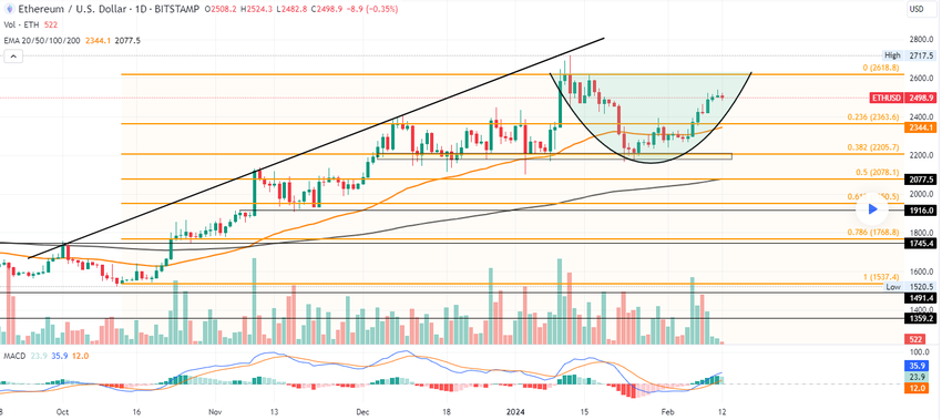L’Ethereum a également rebondi fermement à partir d’une zone de demande cruciale autour de $2,200 – s’engageant dans une tendance haussière claire dans le processus. Une configuration haussière de fond d’arrondi a également pris forme, signalant potentiellement un renversement de tendance visant la résistance à $2,600.