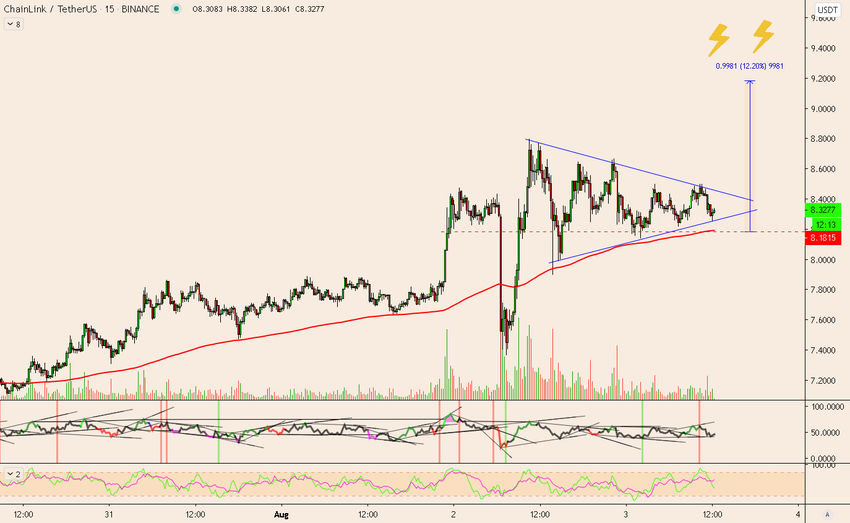 Le trader de cryptomonnaies @LSDinmycoffee a publié un graphique du LINK et affirme que le cours pourrait dépasser son actuel triangle symétrique pour remonter vers un sommet à 9,30$. Depuis la publication de ce tweet, le cours a déjà dépassé son triangle et atteint l’objectif mentionné.