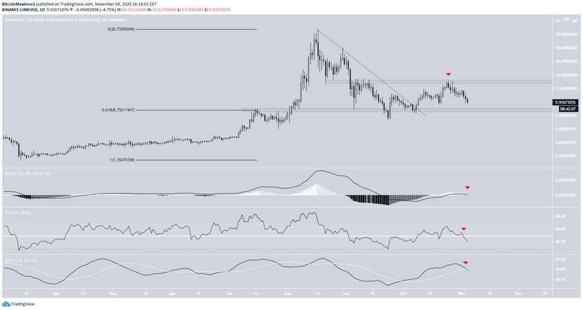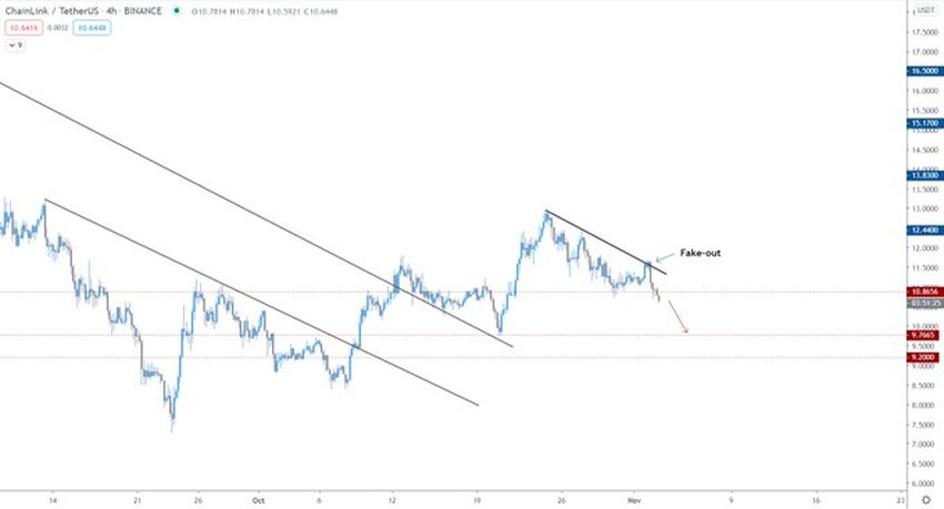 Le cours de Link suivait une ligne de résistance descendante depuis le 17 août. Le 8 octobre, il a dépassé cette ligne, avant d’atteindre un sommet à 13,05$. Il a toutefois été rejeté par la résistance des 13,10$ peu après, et se trouve depuis en déclin.