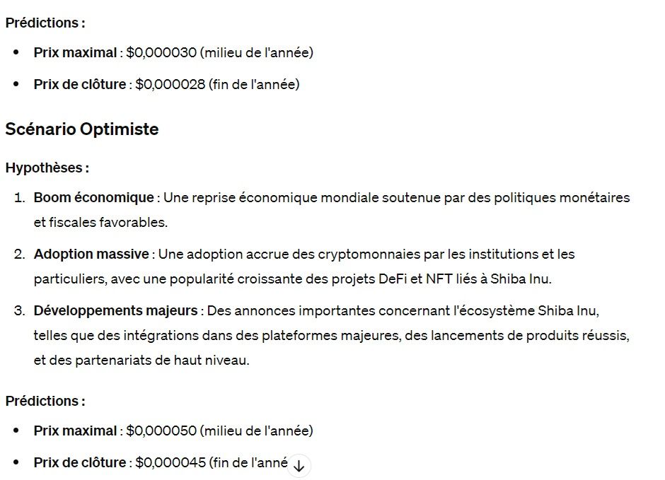 En conséquence, c’est tout naturellement que ChatGPT 4o s’est positionné pour nous sur la question. Naturellement, le passé très récent de Shiba Inu invite à la confiance. Pour ces raisons, l’IA ChatGPT 4o a des perspectives bullishs pour le jeton SHIB pour deux des trois scénarios. Afin de nous apporter une réponse précise, la dernière version du chatbot d’OpenAI nous a élaboré trois scénarios, du plus pessimiste au plus optimiste.