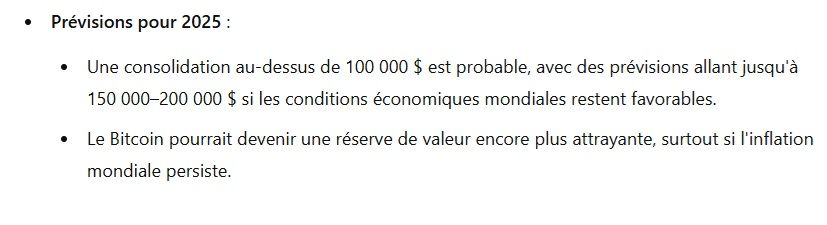 Du côté des régulations, l’année 2025 pourrait être encore plus positive pour Bitcoin et le reste des cryptomonnaies. D’après ChatGPT, 2025 pourrait être l’année de l’adoption avec un environnement beaucoup plus clair en termes de régulations. Potentiellement, les produits liés aux cryptomonnaies pourraient proliférer grâce à un tas d’altcoins qui sont susceptibles d’intéresser les investisseurs. Les ETF autour du XRP, de Solana ou encore d’Hedera pourraient être approuvés tôt ou tard.