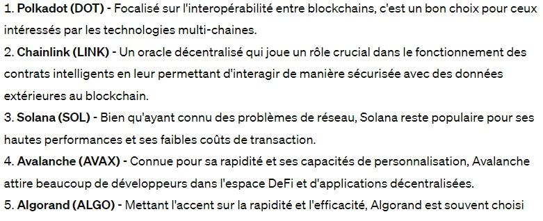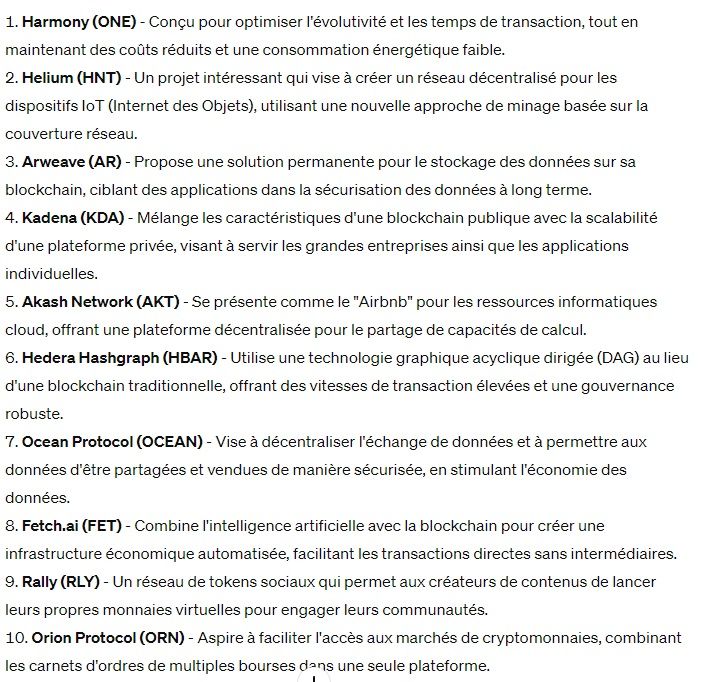 Même si les IA se concentrent bien souvent sur des altcoins jugés plus sûrs, ChatGPT 4 nous aura cette fois bien surpris. En effet, puisque le chatbot nous a également partagé quelques jetons à tenir en compte pour le mois à venir. Pour plusieurs de ces pièces, elles pourraient soit surfer sur une bonne dynamique actuelle ou sur une narrative crypto captivante. Par exemple, on remarque des cryptomonnaies qui font régulièrement parler d’elles, avec OCEAN, FET ou encore Akash Network (AKT). Ces trois jetons font régulièrement les gros titres notamment de par leur particularité d’entretenir des liens avec l’intelligence artificielle.
