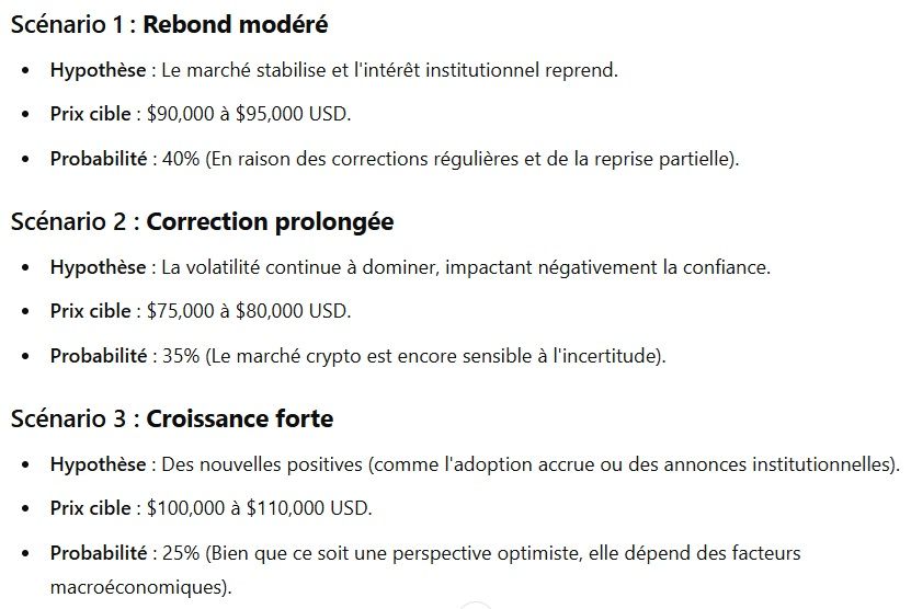 Ensuite, un scénario plus modéré table non pas sur une poursuite de la baisse mais sur un rebond. En conséquence, la fourchette de prix envisagée est située entre les 90 000 $ et 95 000 $. Cela représenterait une belle hausse par rapport au prix actuel. Les probabilités sont également très fortes pour ce scénario puisque celui-ci est le plus probable : 40 %.