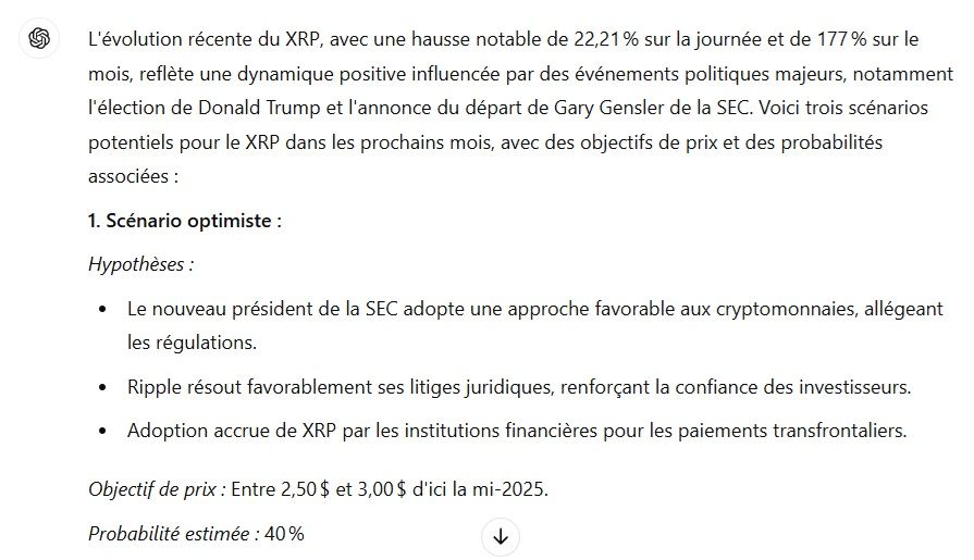 Avec Gary Gensler désormais absent du côté des fauteurs de troubles, ChatGPT s’attend à de belles performances pour le XRP. Avec une administration plutôt positive pour la crypto qui devrait prendre place, les scénarios sont globalement haussiers.