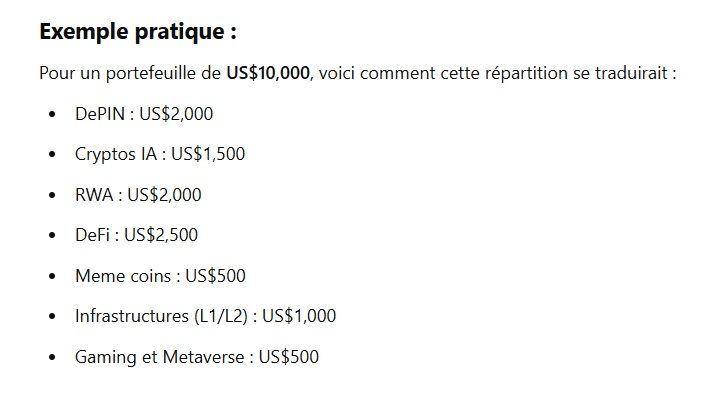 Pour un investissement de 10 000 $, la répartition serait la suivante : 2 000 $ pour les DePIN, 1 500 $ pour les cryptos IA, 2 000 $ pour les RWA, 2 500 $ pour les DeFi, 500 $ pour les meme coins, 1 000 $ pour les L1/L2 et 500 $ pour les jetons Gaming.