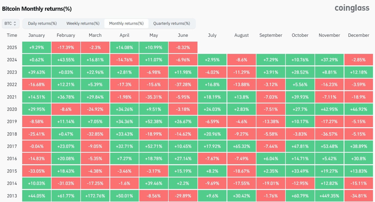 SponsoredD’après les données historiques du Bitcoin, tout peut vraiment arriver au cours de ce mois de juin puisque depuis 2013, 6 mensualités se sont achevées positivement et 6 se sont achevées négativement. Ce mois de juin 2025 permettra donc de départager la hausse et la baisse.