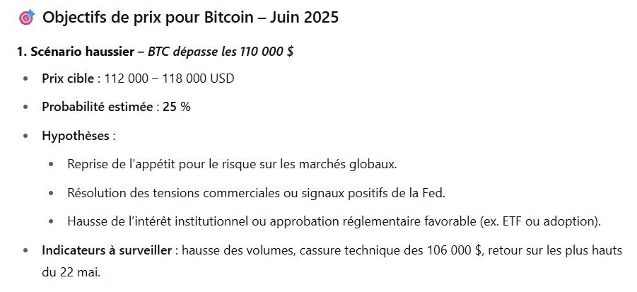 En raison des dernières performances du BTC, ChatGPT n’est pas aussi confiant que lors du mois de mai. L’intelligence artificielle n’écarte pas totalement un retour sous les 95 000 $, en donnant 25 % de probabilités à un scénario envisageant une fourchette de prix entre 88 000 $ et 95 000 $. Malheureusement, l’issue du mois pourrait être négative à cause des conditions macroéconomiques : inflation et tarifs provoquant potentiellement les ventes de certaines grosses baleines Bitcoin.