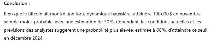 Même s’il n’en faut pas beaucoup plus pour le Bitcoin, ChatGPT ne s’attend pas particulièrement à un prix de 100 000 $ pour novembre. D’après l’IA, il faudrait davantage patienter jusqu’à décembre, voire jusqu’à l’année 2025. Les probabilités pour les deux mois restants de l’année sont de 30 % et 60 % respectivement.