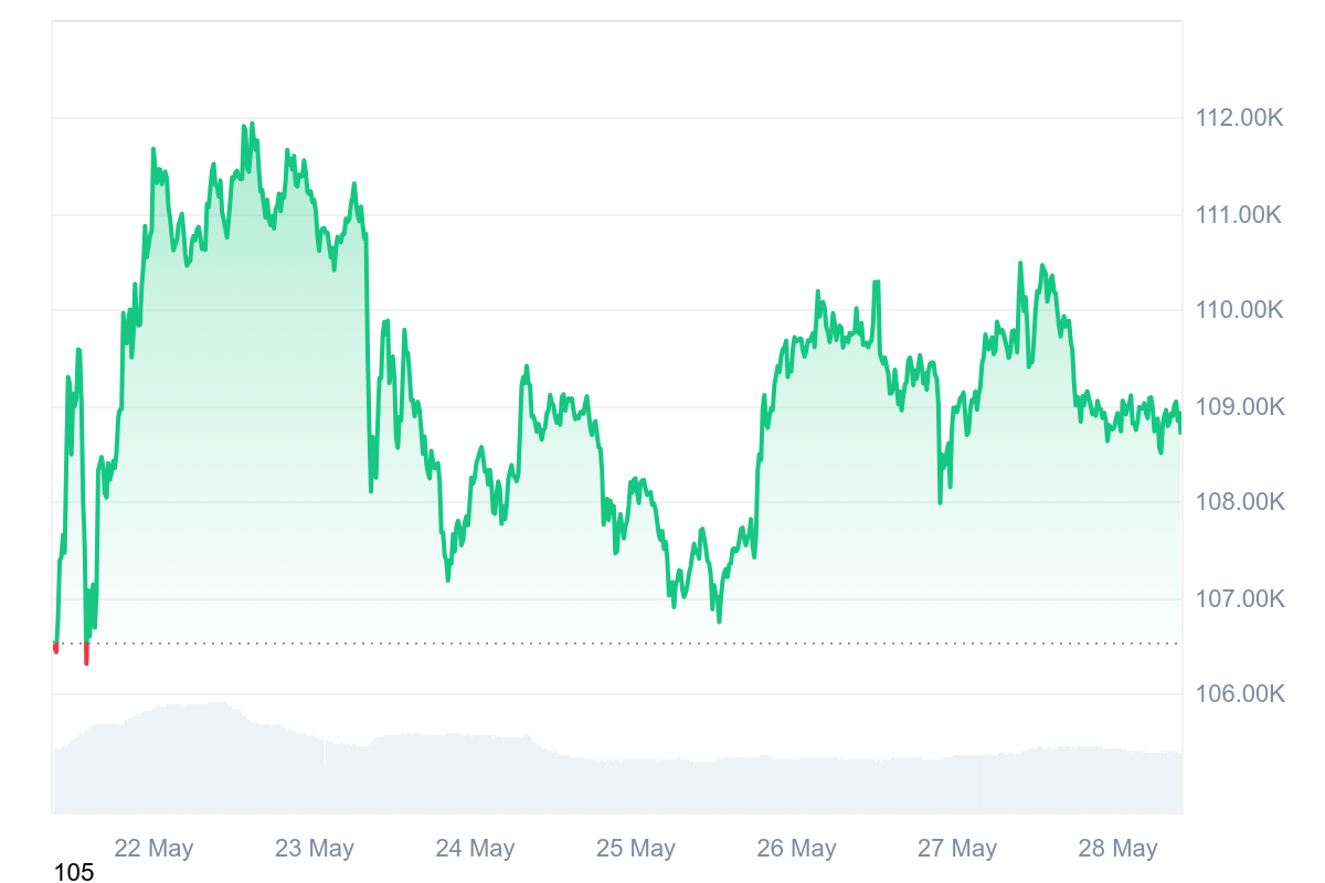 Après un énième ATH le 22 mai dernier à 111 970 $, le cours du Bitcoin se négocie maintenant à 108 718 $ après une hausse hebdomadaire de 2 %.