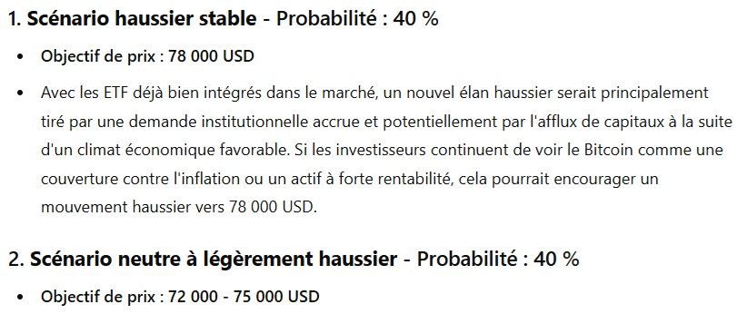 Enfin, le troisième scénario table pour sa part sur une légère correction du prix du Bitcoin. ChatGPT ne s’attend pas vraiment à la réussite de ce scénario mais il a tout de même été préparé. L’IA estime que le pourcentage de réussite de ce scénario est de 20 %, alors que la fourchette de prix annoncée est entre 65 000 et 68 000 $.