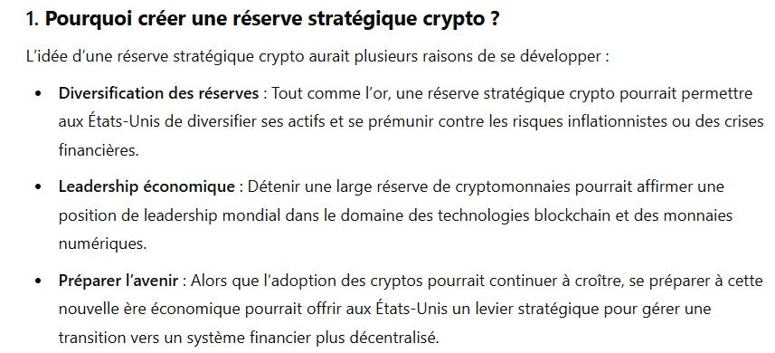 Premièrement, ChatGPT soutient qu’une réserve stratégique crypto serait une très bonne chose, puisque cela permettrait de diversifier les réserves d’un pays. En plus de l’or, élément incontournable, les cryptomonnaies seraient une bonne alternative, notamment en raison de leur essor actuel. Cela permettrait ainsi aux Etats-Unis de diversifier leurs actifs et surtout, de maintenir une position de leadership à l’international.
