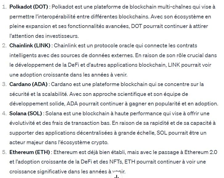 Comme évoqué, 5 cryptomonnaies ou altcoins ont été mis en avant par l’intelligence artificielle ChatGPT. Bien connues de tous, elles ont selon le chatbot la possibilité de faire de très belles performances d’ici 2025. Sans ordre spécifique, les 5 altcoins choisis sont Ethereum, Solana, Chainlink, Polkadot et Cardano. Sur ces 5 jetons, Solana Chainlink et Cardano sont les cryptomonnaies qui ont le mieux performé en 2023. Pour autant, cela ne veut pas dire qu’Ethereum ou Polkadot ont eu des performances négatives. D’ailleurs, l’IA préserve une très grande estime pour ces projets.