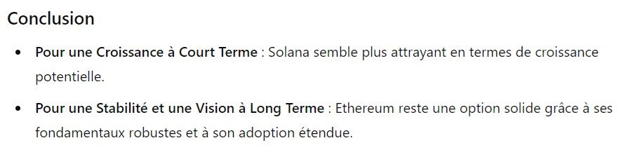 ChatGPT s’intéresse également aux facteurs qui pourraient encourager une hausse de prix à l’avenir. De ce côté, les deux écosystèmes marquent des points. Malgré tout, Ethereum semble avoir un avantage sur le long terme avec des ETF qui ont déjà été approuvés et n’attendent désormais plus que leur ouverture. Même si Solana est et restera une cryptomonnaie à fort potentiel avec ou sans ETF, les certitudes semblent être davantage présentes du côté du jeton ETH.