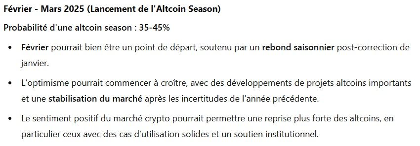 Au fur et à mesure que l’année 2025 avance, ChatGPT s’attend à une évolution intéressante des probabilités, sans jamais redescendre bien bas. Pour le printemps, entre le mois d’avril et le mois de mai, les probabilités d’une altcoin season sont de 30-40 %.
