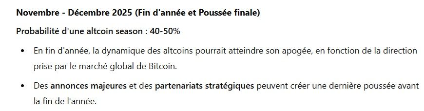 Enfin, si la fin de l’été ne devrait probablement pas déboucher sur une altcoin season, ce n’est pas pareil pour la fin d’année. Pour la fin d’année 2025 (novembre et décembre), les probabilités sont fortes (40-50 %) et pourrait être la poussée finale.