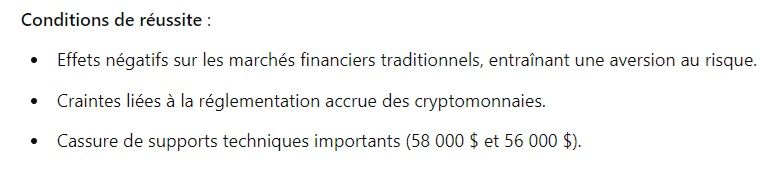 Premièrement, le scénario baissier, le moins probable, avance un objectif de prix négatif. Alors que le BTC s’échange actuellement à 60 500 $, le scénario baissier enverrait le prix de l’actif entre 52 000 $ et 56 000 $. Il mise notamment sur des conditions macroéconomiques difficiles. Mais encore, cela pourrait advenir si le Bitcoin perd son support aux alentours des 58 000 $.