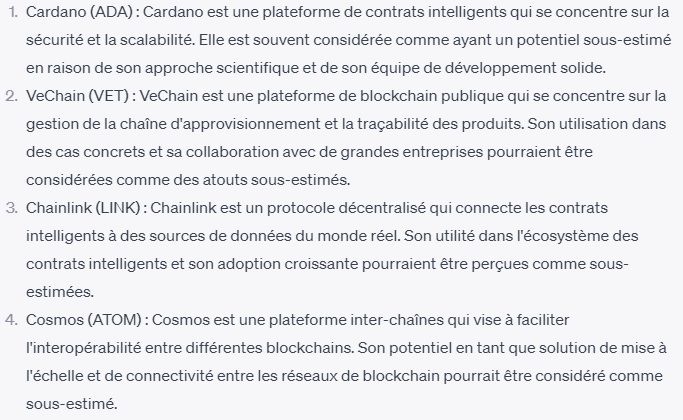 Ainsi, ChatGPT nous recommande les quatre projets suivant : Cardano et son jeton ADA, ChainLink et sa crypto LINK, VeChain et son fameux VET ou encore Cosmos et sa pièce ATOM. Pour l’intelligence artificielle, il s’agit là de plusieurs actifs qui sont bien souvent sous-coté ou sous-évalué par les investisseurs crypto. Ce, même si Cardano, par exemple, possède une des plus grosses capitalisations du marché.