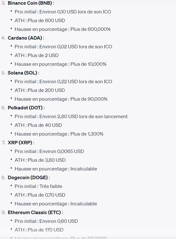 En effet, puisque certains d’entre eux ont rapporté gros, en ne faisant parfois perdre que très peu. Alors que ChatGPT a également des difficultés à communiquer sur les hausses du Dogecoin (283 361,54 %) et du XRP (58 976,92 %), on remarque que les évolutions positives atteignent quelques milliers de pourcentage. Le BNB de Binance se démarque avec un accroissement inimaginable de 600 000 % entre son ICO et son ATH.