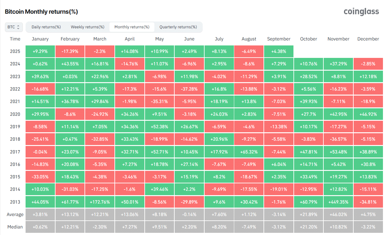 Historiquement, septembre se révèle défavorable au Bitcoin, avec une performance moyenne de -3,14 %. Ce schéma saisonnier pourrait expliquer la récente faiblesse, avant un retournement attendu en octobre.