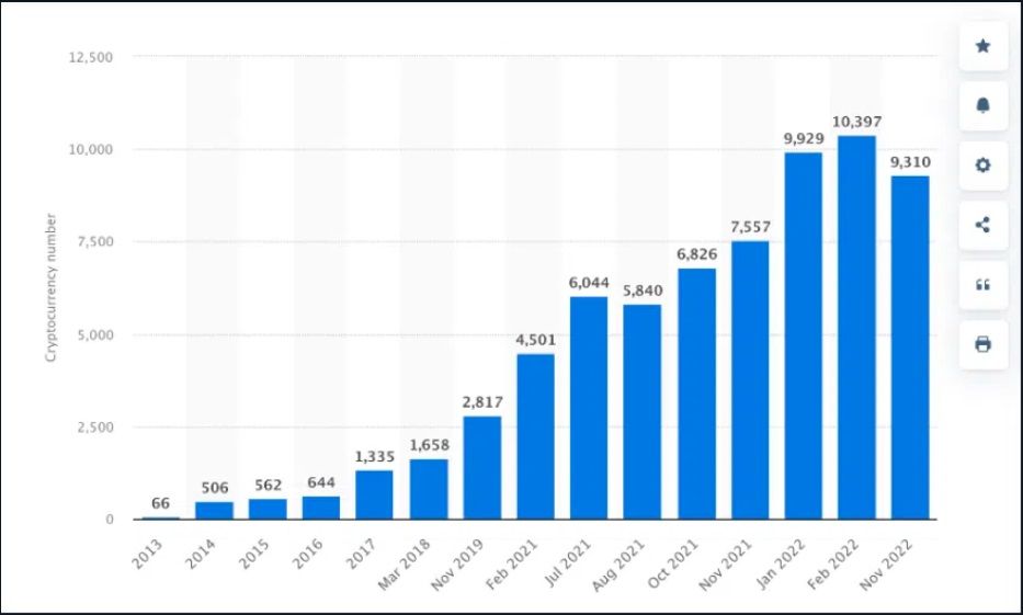 Les données de Statista montrent qu’au premier trimestre 2022, le nombre de crypto-monnaies cotées sur le marché (9 929) a augmenté d’environ 250 % par rapport à la fin 2019 (2 817). Toutefois, ce nombre est légèrement retombé à 9 310 en novembre 2022.