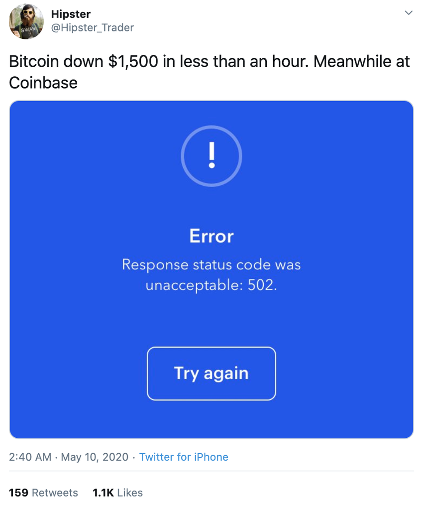 Bien qu’il soit le «visage» du monde des crypto-monnaies pour de nombreux nouveaux arrivants, Coinbase continue d’avoir une infrastructure médiocre. Une autre panne a été signalée le 30 avril lorsque le Bitcoin est passé de 8 000 $ à 9 470 $. Coinbase, sans surprise, a tomber en panne pendant la flambée. Pour être sûr, la bourse a toujours eu du mal à répondre aux demandes de ses propres clients.