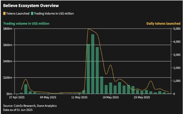 Le Launchpad Believe sur Solana a capturé l’attention du marché le 13 mai avec une rafale de lancements de tokens. En effet, le projet a enclenché la première avec plus de 500 lancements par jour et un volume de trading de 700 millions de dollars à son apogée. Cependant, ce modèle de lancement a ensuite fait l’objet de nombreuses critiques, provoquant un déclin progressif malgré un départ prometteur.