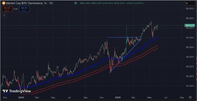Malgré la hausse de prix du Bitcoin, les altcoins n’ont pas réussi à prendre de l’élan. La BTC dominance est passée à 65 %, reflétant une forte concentration du capital sur un seul et même actif. En conséquence, la rotation vers d’autres actifs a été extrêmement limitée. Les tendances techniques suggèrent que la domination reste solide, avec aucun signal de retournement en vue. Les conditions de marché continuant de favoriser Bitcoin, les autres cryptomonnaies ont été reléguées au second plan, retardant la tant attendue altcoin season indéfiniment.