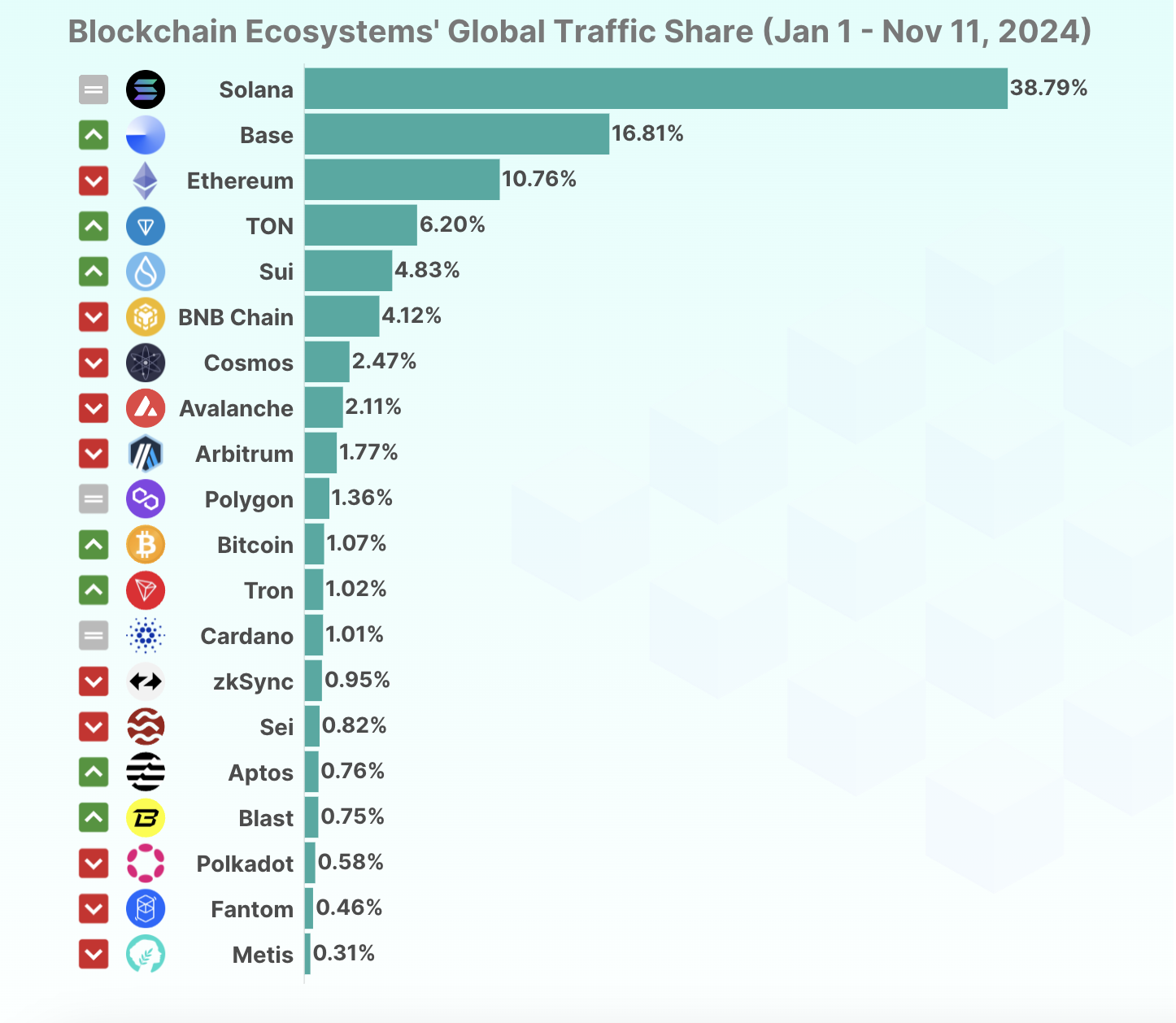 En mesurant les parts de trafic mondial des 20 principaux écosystèmes blockchain, Solana affiche une performance remarquable avec un pourcentage impressionnant de 38,79 % des parts totales de trafic. En deuxième place, Base détient 16,81 %, portant le total de ces deux écosystèmes à près de 56 % au 11 novembre.