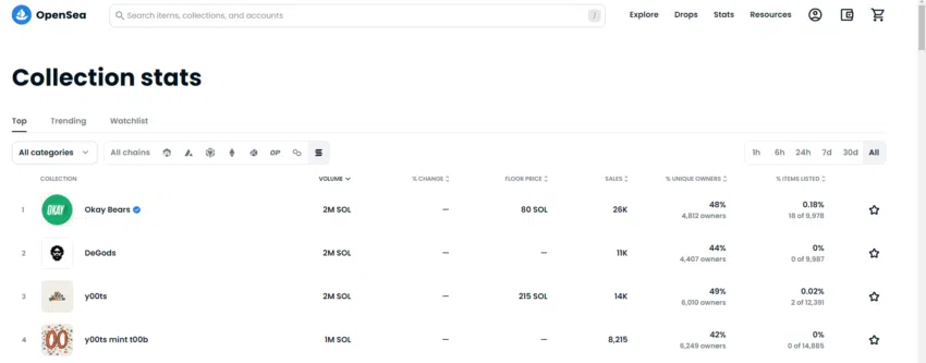 Sur OpenSea, les deux collections sont en tête du classement des projets Solana par volume de trading. Hier, DeGods a réalisé un volume d’échanges de 2,2 millions de SOL, tandis que y00ts a enregistré un volume de 1,7 million de SOL. Par conséquent, le départ des deux projets aura sans doute un impact sur le réseau.