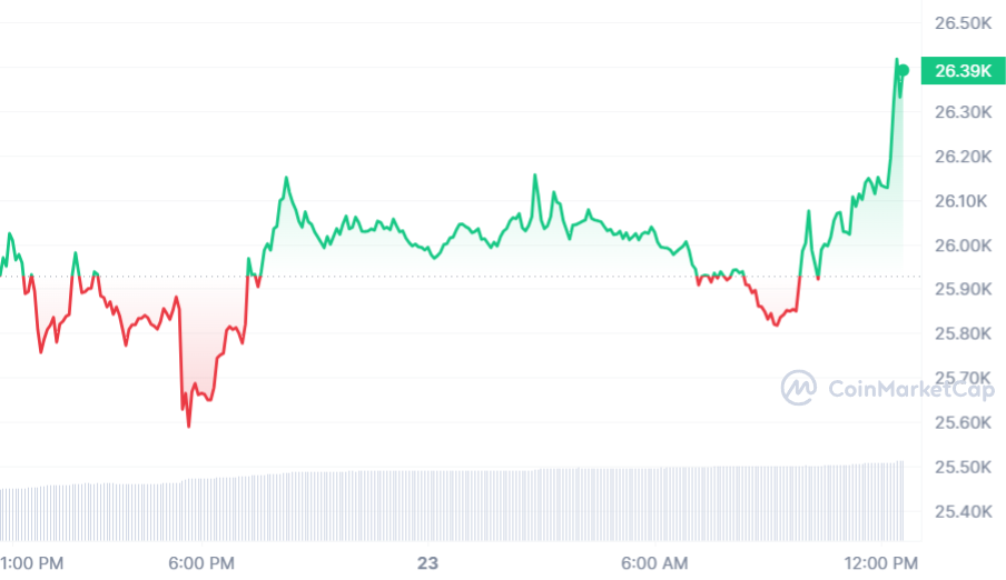 Au moment de rédaction, le cours de l’actif est en hausse de 1,21 % et s’échange à 26 375 $.