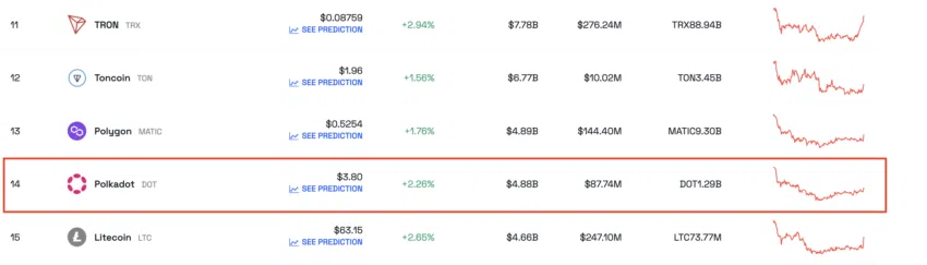 Au moment où nous publions ces lignes, Polkadot (DOT) a une capitalisation boursière de 4,88 milliards de dollars et se positionne au 14e rang du classement des cryptomonnaies par capitalisation boursière.