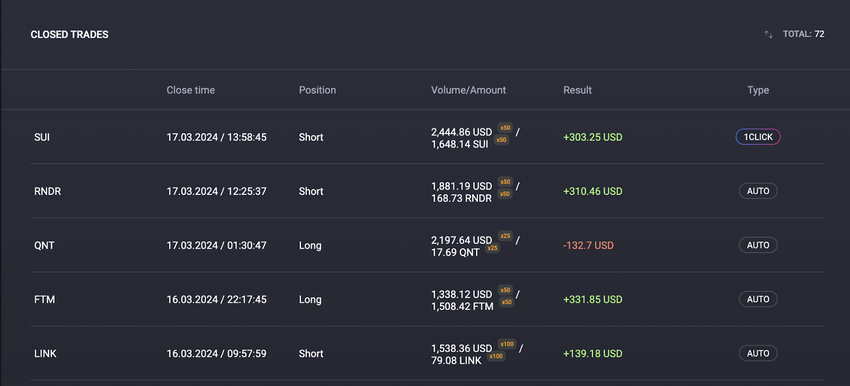 Par exemple, dans l’exemple suivant, le robot a tradé le token SUI avec un effet de levier de 50x. En l’espace de 3 minutes, le robot a clôturé la transaction et a réalisé un joli profit.