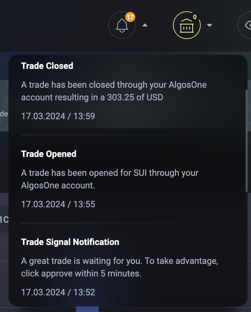 En revanche, pour les trades manuels, maintenant connus sur la plateforme AlgosOne sous le nom de trades 1Click, AlgosOne vous notifiera d’abord de la transaction. Pour les utilisateurs de la version web, cette notification apparaîtra en bas à gauche de votre écran, vous assurant d’être rapidement informé des opportunités de transactions potentielles.