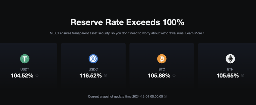 De plus, MEXC offre une Preuve de réserve pour garantir la sécurité des actifs et maintenir la transparence pour ses utilisateurs. Cela permet aux utilisateurs de trader en toute confiance, sans crainte de retraits massifs. Les taux de réserve sont mis à jour tous les deux mois. À compter du 1ᵉʳ décembre 2024, les derniers taux de réserve pour diverses cryptomonnaies sont les suivants :