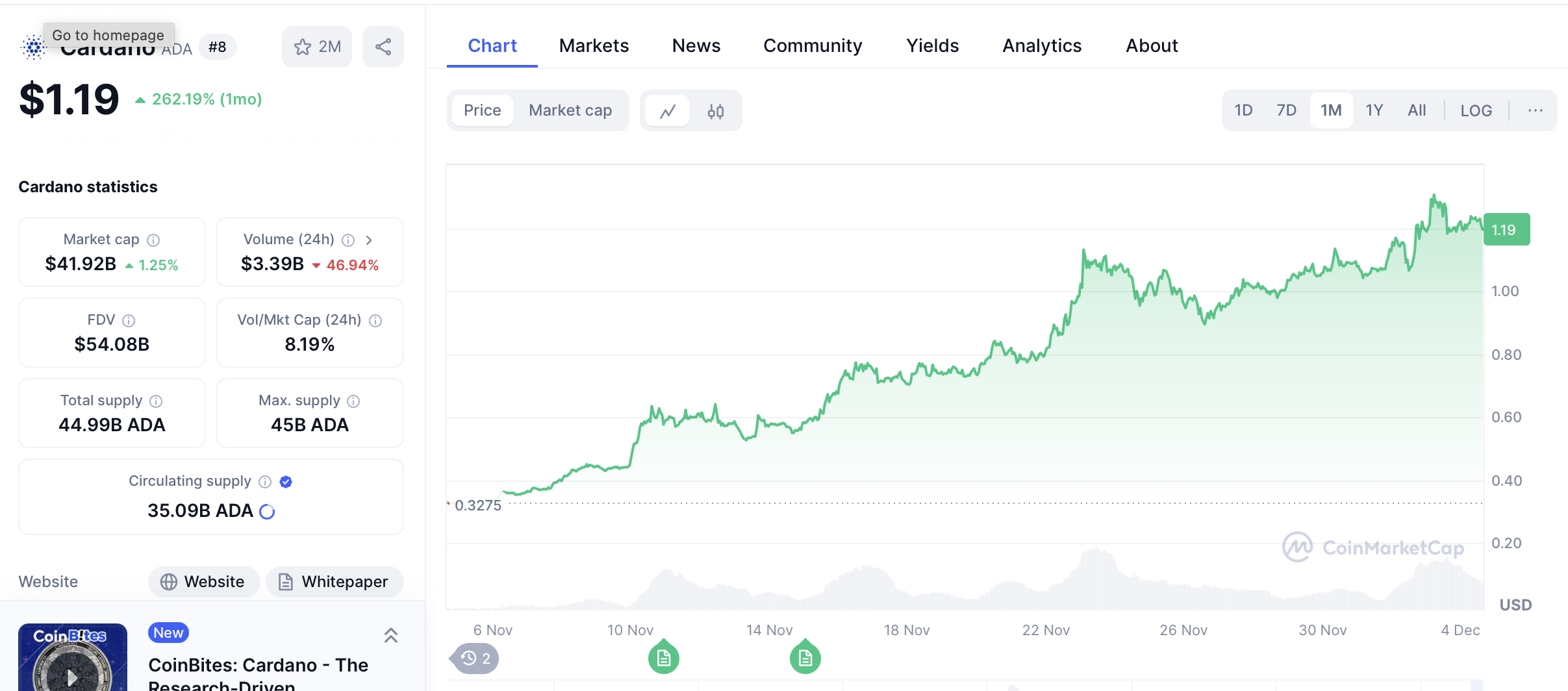 Parmi les principales cryptomonnaies du top 10, le cours d’ADA s’est imposé comme l’un des plus performants depuis la reprise du marché, juste derrière le XRP. En novembre, la valeur du jeton de Cardano a enregistré une hausse fulgurante de 256 %, franchissant avec succès la résistance du 1 $.