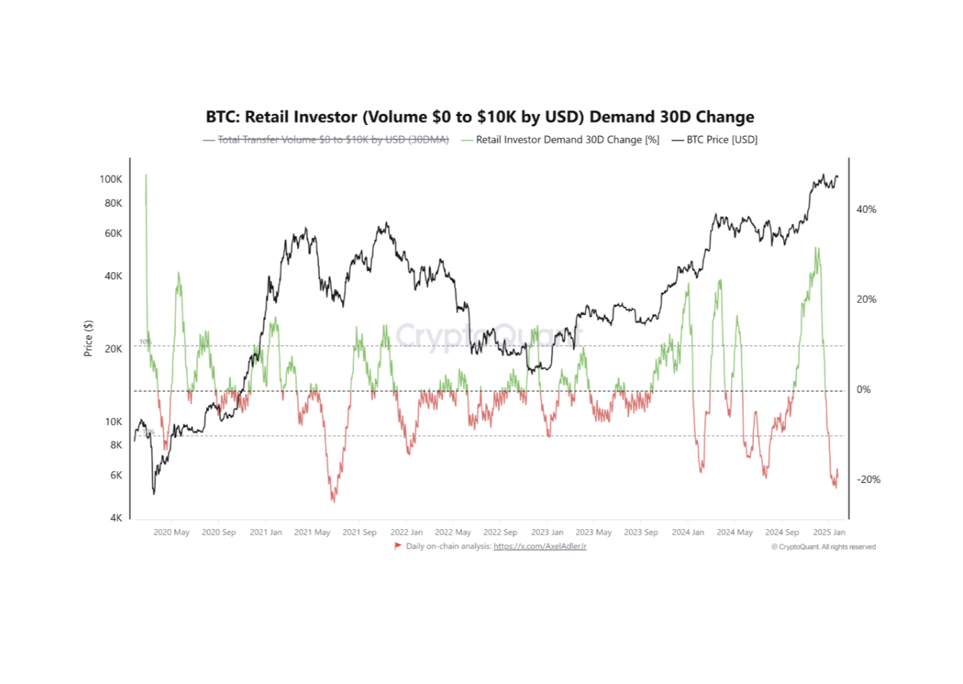 SponsoredAinsi, selon Caucenomy, au cours des derniers jours, l’activité on-chain pour les transactions en BTC allant jusqu’à 10 000 $ a chuté de 19,34 %, reflétant une baisse de l’activité de trading de détail. Cette baisse s’est produite alors même lorsque le cours de la pièce a atteignait un sommet record (ATH) de 109 588 $ ce lundi 20 janvier.