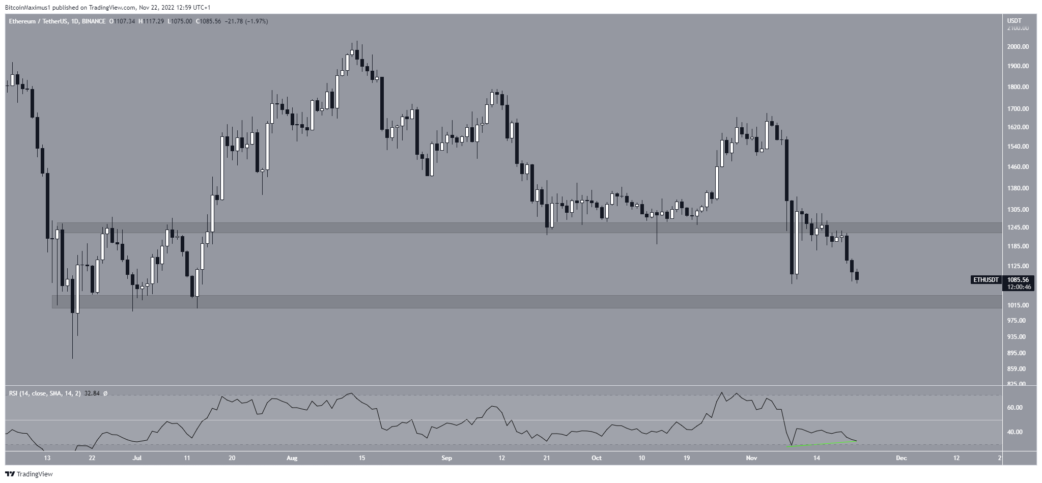 De même que pour le BTC, un regain de la zone des 1 250 $ confirmerait que le bottom est atteint. De plus, un rebond du cours actuel validerait une divergence haussière (ligne verte) du RSI journalier.