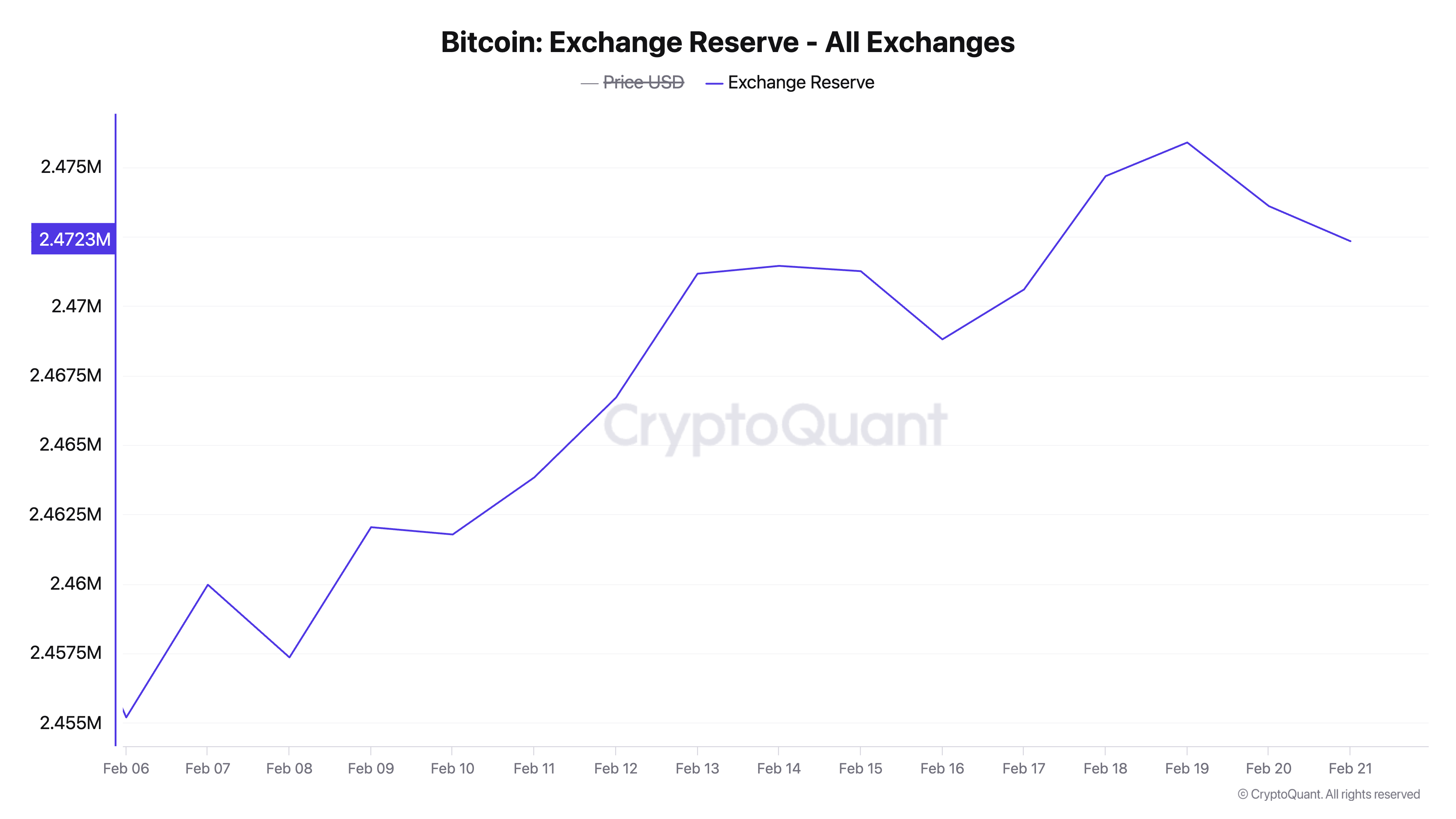 Les données de CryptoQuant montrent une augmentation constante des réserves de Bitcoin sur les plateformes d’échange crypto depuis le 6 février. Au moment de la rédaction de cet article, 2,47 millions de BTC sont détenus dans des portefeuilles d’exchanges, pour une hausse de 1 % depuis le début du mois.