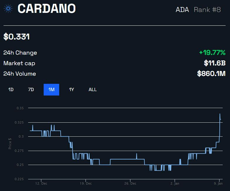 L’ADA a bondi de 20 % au cours des dernières 24 heures, ce qui en fait l’une des valeurs les plus performantes de la journée. L’actif a ainsi atteint son prix le plus élevé depuis la mi-novembre, soit 0,331 $ au moment de la rédaction de cet article.
