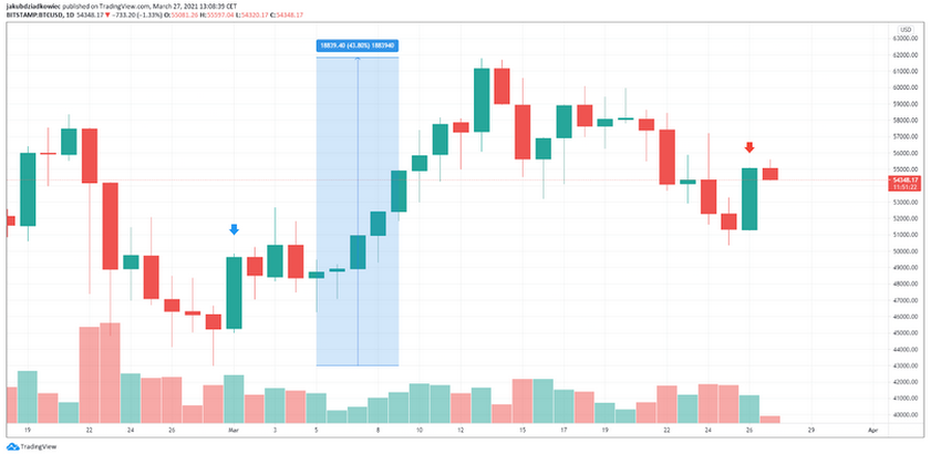 Le 26 correspondait au dernier vendredi de mars Ce jour-là, des options totalisant environ 6 milliards de dollars ont expiré. Comment Bitcoin a-t-il réagi ? Le cours a immédiatement augmenté et a généré un chandelier de recouvrement haussier (flèche rouge) avec un corps de 7,28%. Le cours de Bitcoin est ainsi passé de 51 200$ à 55 000$. De même, lorsque le BTC a généré une chandelle similaire le 1er mars (flèche bleue), il a également augmenté d’un total de 44%.