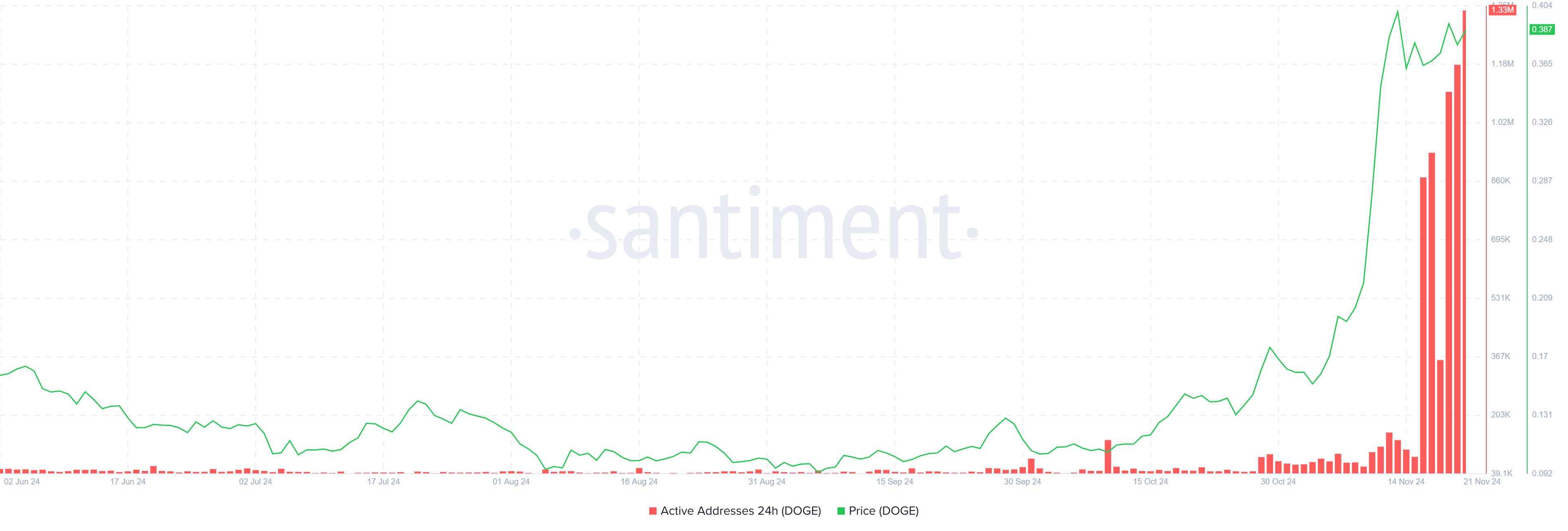 Les adresses actives de Dogecoin ont atteint un niveau record, dépassant 1,33 million de participants quotidiens. Cette hausse reflète bien une demande accrue sur le réseau, un indicateur haussier pour la crypto en question. En effet, une participation accrue est souvent corrélée à la hausse des cours, car une forte activité témoigne d’un fort intérêt des investisseurs e d’une plus ample adoption de DOGE.