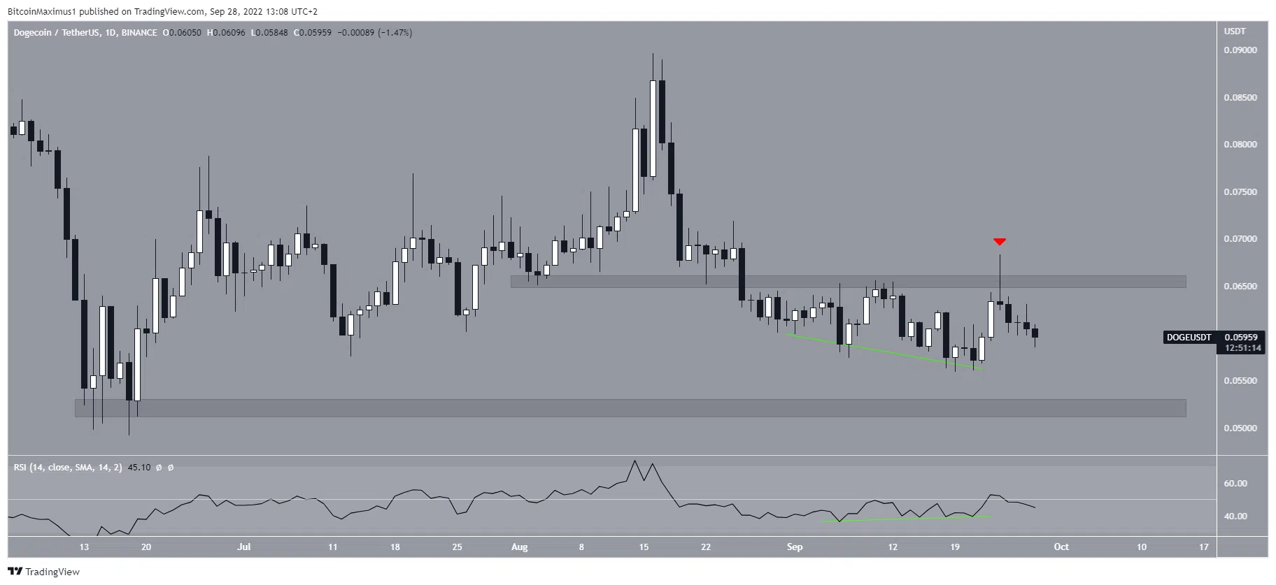 Tout comme le cours de Shiba Inu, le DOGE a cherché à amorcer un mouvement de hausse le 21 septembre. Ce mouvement a fait suite à une période durant laquelle le RSI quotidien a généré une divergence haussière (ligne verte).