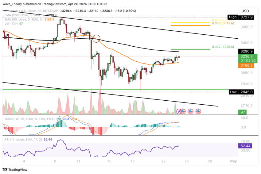 Sur le graphique 4 heures du cours d’Ethereum, un croisement de la mort s’est récemment matérialisé, solidifiant le sentiment baissier à court terme. Cependant, si ETH maintient son Momentum haussier et dépasse le niveau de résistance de Fibonacci de 0,382 autour de 3 320 $, cela pourrait inciter les EMA à subir un croisement doré.