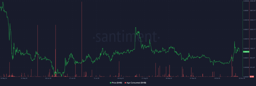 Du point de vue des données on-chain, si l’on se penche sur l’indicateur Age Consumed (l’ancienneté d’une pièce au moment de son mouvement) de SHIB, on constate certaines anomalies ; en effet, plus de 3 billions de jetons ont été déplacés le 2 novembre. Le déplacement de tokens plus anciens pourrait constituer l’une des raisons du repli à court terme de l’actif.