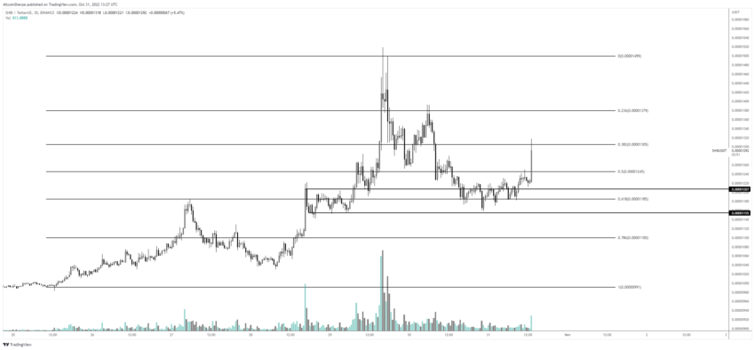 Le cours de SHIB affiche notamment une perte de vitesse de plus de 9 % au moment de la mise en page de cet article. Selon le trader et analyste Altcoin Sherpa, le cours pourrait former un schéma de double sommet en novembre, avec un autre sommet local autour de la marque de 0,00001519 $.