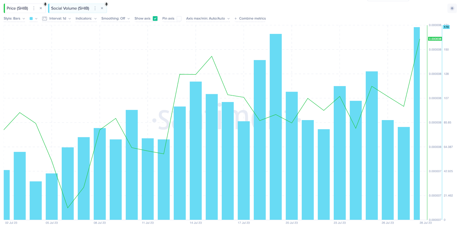 Le 2 juillet, le score du volume social de Shiba Inu était de 44. Le 29 juillet, il a augmenté de 280 % pour atteindre 170.