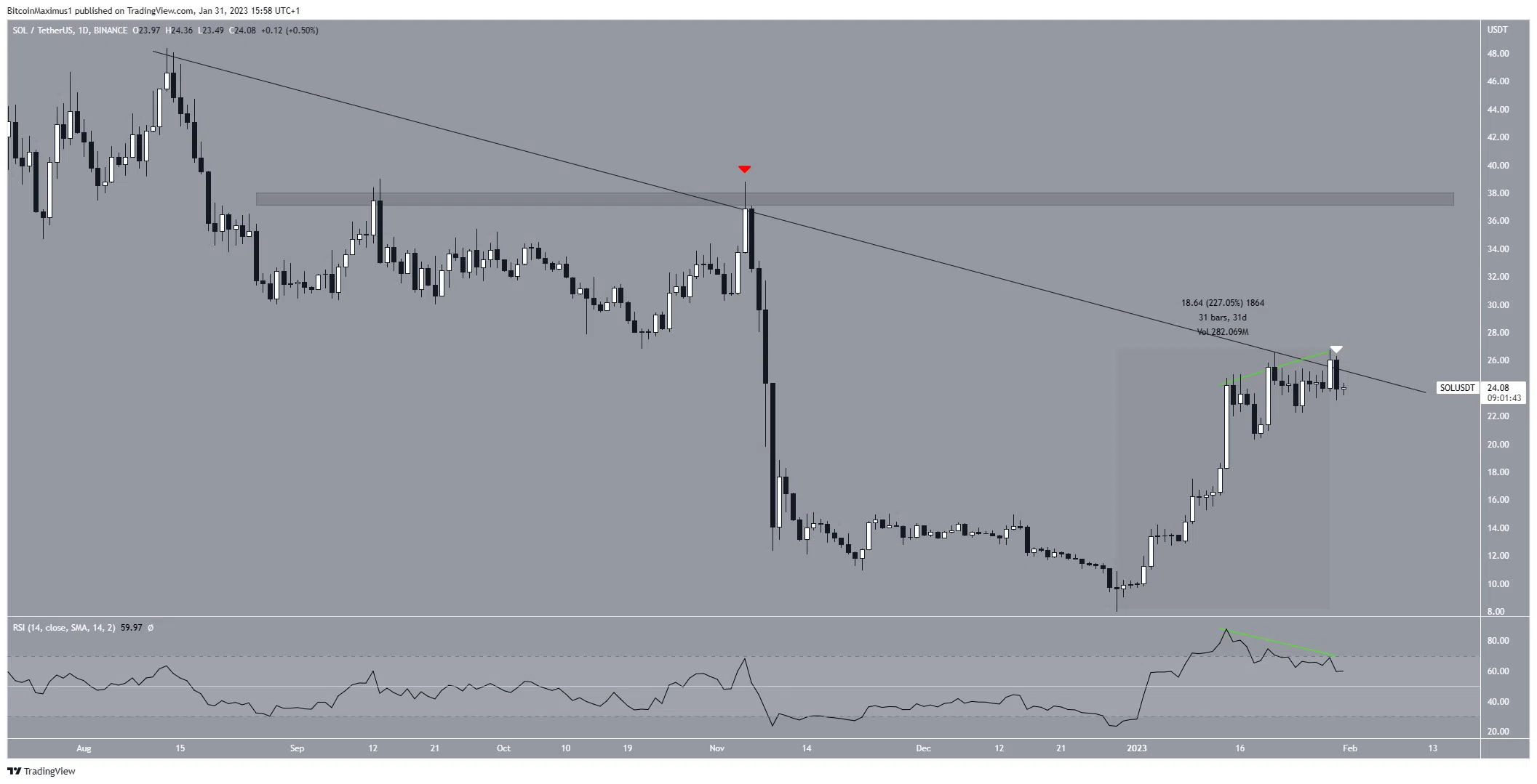 Depuis le 13 août 2022, le cours de la crypto SOL évolue sous une ligne de résistance descendante. Cette ligne a d’ailleurs rejeté le cours au début du mois de novembre, faisant chuter l’actif à un minimum de 8 dollars le 29 décembre 2022. Le cours a ensuite amorcé une considérable tendance à la hausse, laquelle a entraîné un gain de 227 %.