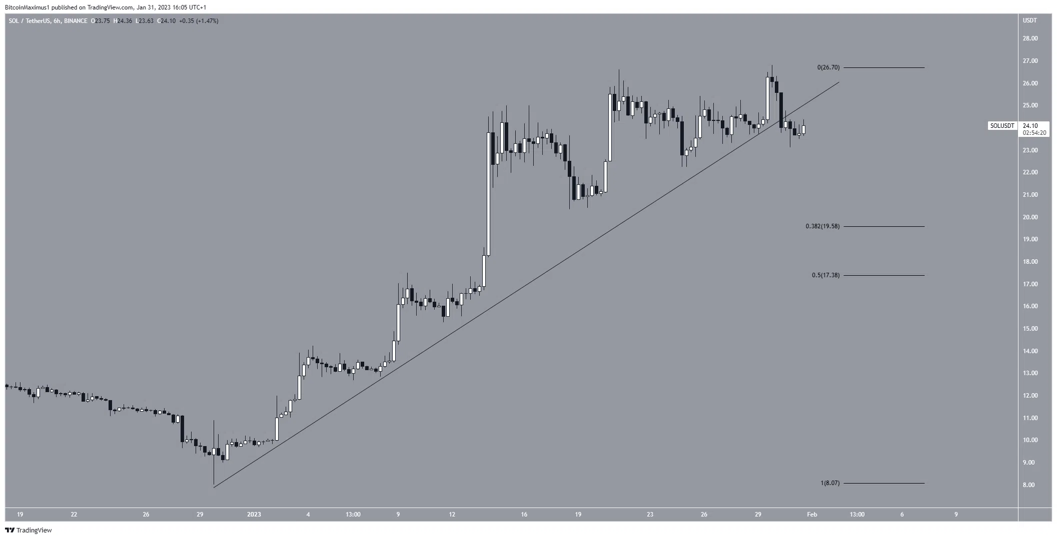 Il est donc possible que le cours du SOL chute jusqu’au support du retracement de Fibonacci 0,382 ou 0,5, respectivement situés à 19,50 $ et 17,31 $.