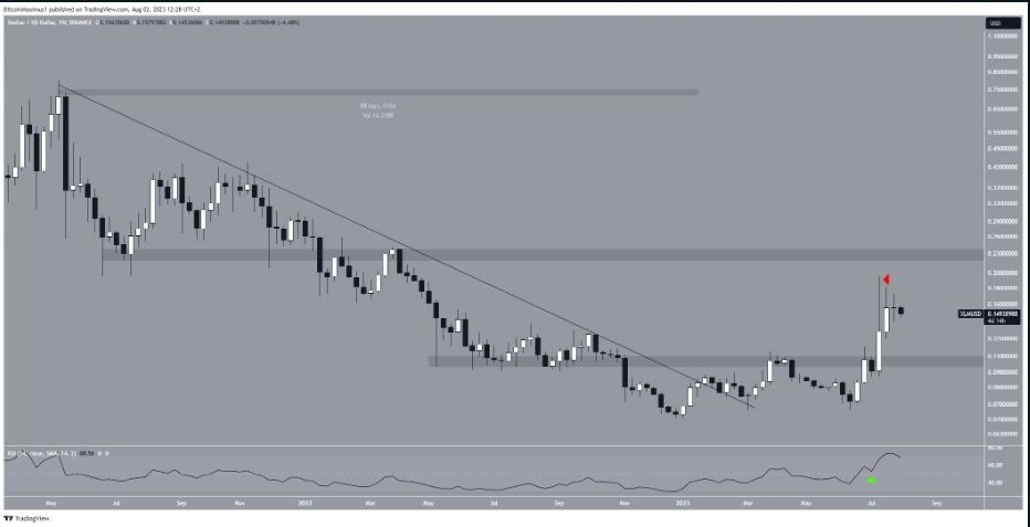 Après la rupture de la ligne de résistance à long terme, le prix a également dépassé la zone de résistance horizontale de 0,105 $, confirmant ainsi la rupture haussière. Cela a conduit à un nouveau sommet annuel de 0,195 $ en juillet.