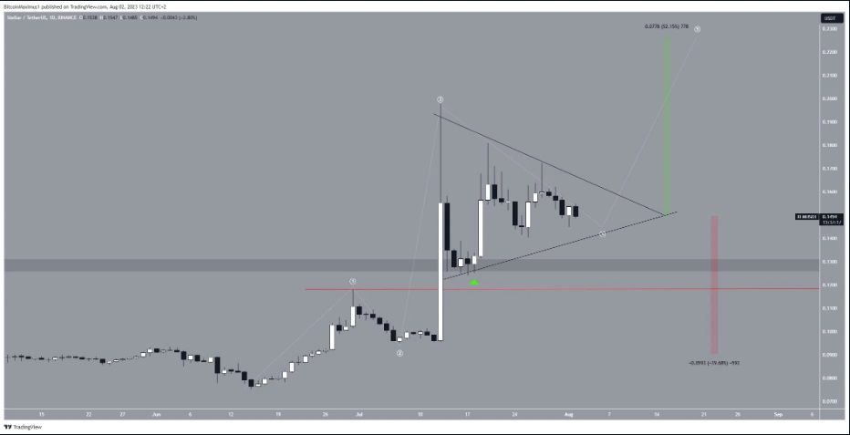 Selon le décompte actuel des vagues d’Elliott (lignes blanches), le prix du XLM semble se trouver dans la quatrième vague d’un mouvement haussier en cinq vagues. Cette quatrième vague a formé un triangle, ce qui est généralement observé au cours de cette phase de la vague.
